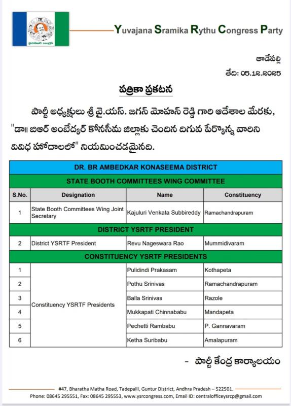 తాడేపల్లి: వైయస్ఆర్ కాంగ్రెస్ పార్టీ అధినేత వైయస్ జగన్ మోహన్ రెడ్డి ఆదేశాల మేరకు పార్టీ బూత్ కమిటీ విభాగం రాష్ట్ర జాయింట్ సెక్రటరీగా రామచంద్రాపురం నియోజకవర్గానికి చెందిన కాజులూరి వెంకట సుబ్బారెడ్డిని నియమించారు. ఈ మేరకు పార్టీ కేంద్ర కార్యాలయం నుంచి శుక్రవారం ఓ ప్రకటన విడుదల చేశారు.