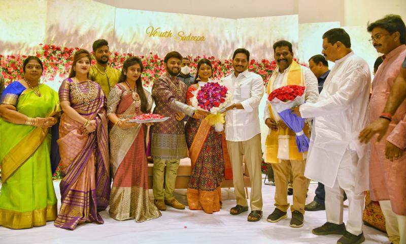 అమ‌రావ‌తి: గుంటూరు వెస్ట్‌ ఎమ్మెల్యే మద్దాలి గిరిధర్‌ రావు కుమారుడి వివాహ వేడుకకు ముఖ్య‌మంత్రి వైయ‌స్ జ‌గ‌న్‌మోహ‌న్‌రెడ్డి హాజ‌ర‌య్యారు. మంగళగిరి సీకే కన్వెన్షన్‌లో జరిగిన వివాహ వేడుకలో పాల్గొని వరుడు మద్దాలి కృష్ణ వినూత్, వధువు చలమచర్ల లక్ష్మీ సుదీపలను ముఖ్యమంత్రి ఆశీర్వ‌దించారు.