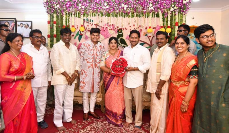కాకినాడ: జగ్గంపేట నియోజకవర్గంలో బుధవారం ముఖ్యమంత్రి వైయస్ జగన్మోహన్రెడ్డి పర్యటించారు. వైయస్ఆర్సీపీ ఎమ్మెల్యే జ్యోతుల చంటిబాబు కుమార్తె వివాహ వేడుకలో ముఖ్యమంత్రి పాల్గొన్నారు. ఇర్రిపాకలోని ఎమ్మెల్యే జ్యోతుల చంటిబాబు నివాసానికి వెళ్లిన సీఎం వైయస్ జగన్.. నూతన వధూవరులు అన్నపూర్ణ, సాయి ఆదర్శ్ లను ఆశీర్వదించారు. అంతకు ముందు ఇర్రిపాకలో ఏర్పాటు చేసిన హెలిప్యాడ్ వద్ద మంత్రులు,ఎమ్మెల్యేలు సీఎం వైయస్ జగన్కు సాదర స్వాగతం పలికారు.