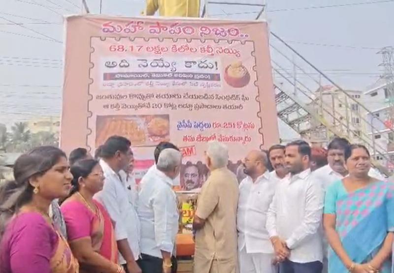 గుంటూరు: తిరుమల శ్రీవారి లడ్డూ అంశాన్ని రాజకీయాలకు వాడుకుంటూ తెలుగుదేశం పార్టీ దుర్మార్గపు ప్రచారానికి పాల్పడుతోందని వైయస్ఆర్ కాంగ్రెస్ పార్టీ గుంటూరు జిల్లా అధ్యక్షుడు అంబటి రాంబాబు తీవ్రంగా మండిపడ్డారు. గుంటూరులోని చిల్లి సెంటర్ వద్ద “ఇది నెయ్యే కాదు” అంటూ అబద్ధాలతో కూడిన ఫ్లెక్సీని తెలుగుదేశం పార్టీ నాయకులు ఏర్పాటు చేయడాన్ని నిరసిస్తూ, ఆ ఫ్లెక్సీ ముందు వైయస్ఆర్సీపీ నాయకులు, కార్యకర్తలతో కలిసి అంబటి రాంబాబు నిరసన తెలిపారు. ఈ సందర్భంగా అంబటి రాంబాబు మాట్లాడుతూ, ముఖ్యమంత్రి చంద్రబాబు నాయుడు ఆదేశాలతోనే తెలుగుదేశం పార్టీ నాయకులు ఇలా బరితెగించి విష ప్రచారం చేస్తున్నారని ఆరోపించారు. తిరుమల లడ్డూలో పంది కొవ్వు సహా ఎలాంటి జంతు కొవ్వు కలవలేదని సీబీఐ స్పష్టంగా చెప్పిన తర్వాత కూడా, తెలుగుదేశం పార్టీ నాయకులు దుర్మార్గపు ప్రచారానికి పాల్పడటం దురదృష్టకరమన్నారు. ఫ్లెక్సీలపై వైయస్ జగన్ మోహన్ రెడ్డి, సుబ్బారెడ్డి, కరుణాకర్ రెడ్డి చిత్రాలను పెట్టి కావాలనే అపనిందలు మోపుతూ విష ప్రచారం చేస్తున్నారని విమర్శించారు. ఈ విధమైన ఫ్లెక్సీలను 24 గంటల్లో తొలగించాలని డిమాండ్ చేశారు. లేని పక్షంలో వైయస్ఆర్ కాంగ్రెస్ పార్టీ నాయకులు, కార్యకర్తలే ఆ ఫ్లెక్సీలను చింపేస్తారని హెచ్చరించారు. తిరుమల లడ్డూ వంటి పవిత్రమైన ప్రసాదాన్ని రాజకీయాలకు వాడుకున్న చంద్రబాబు నాయుడు ప్రజలకు బహిరంగంగా క్షమాపణ చెప్పాలని అంబటి రాంబాబు డిమాండ్ చేశారు. వైయస్ఆర్ కాంగ్రెస్ పార్టీపై, పార్టీ నాయకులపై తప్పుడు ప్రచారం చేస్తే చూస్తూ ఊరుకునే ప్రసక్తే లేదని స్పష్టం చేశారు. చంద్రబాబు నాయుడు, పవన్ కళ్యాణ్ చేసిన ఈ అపచారాన్ని ఆ దేవుడు కూడా క్షమించడని అంబటి రాంబాబు తీవ్ర వ్యాఖ్యలు చేశారు. ఈ నిరసన కార్యక్రమంలో వైయస్ఆర్సీపీ నాయకులు, కార్యకర్తలు పెద్ద సంఖ్యలో పాల్గొన్నారు.