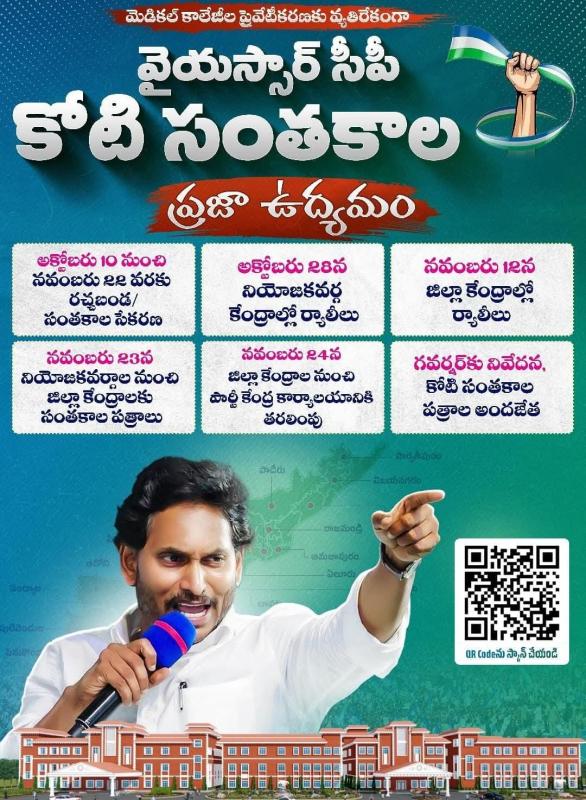 తాడేపల్లి: మెడికల్ కాలేజీల ప్రైవేటీకర్ను వ్యతిరేకిస్తూ వైయస్ఆర్ సీపీ కేంద్ర కార్యాలయంలో కోటి సంతకాల సేకరణ పోస్టర్ను పార్టీ స్టేట్ కో-ఆర్డినేటర్ సజ్జల రామకృష్ణారెడ్డి, ఎమ్మెల్సీలు లేళ్ల అప్పిరెడ్డి, మొండితోక అరుణ్ కుమార్, మాజీ ఎమ్మెల్యే మల్లాది విష్ణు, విజయవాడ మేయర్ రాయన భాగ్యలక్ష్మి, ఎన్టీఆర్ జిల్లా వైయస్ఆర్ సీపీ అధ్యక్షుడు దేవినేని అవినాష్ తదితరులు ఆవిష్కరించారు. ఈ సందర్భంగా సజ్జల రామకృష్ణారెడ్డి మాట్లాడుతూ..` రేపట్నుంచి రాష్ట్రంలో పెద్ద ప్రజా ఉద్యమం ప్రారంభం కాబోతుందని, 45 రోజులకు పైగా ఈ కార్యక్రమం కొనసాగుతుందన్నారు. ప్రభుత్వ మెడికల్ కాలేజీల ప్రైవేటీకరణపై ప్రజా ఉద్యమం చేపట్టి గవర్నర్ దృష్టికి తీసుకెళ్తామన్నారు. సజ్జల రామకృష్ణారెడ్డి ఇంకా ఏమన్నారంటే.. రేపట్నుంచి రచ్చబండ మెడికల్ కాలేజీల ప్రైవేటీకరణను వ్యతిరేకిస్తూ రాష్ట్రంలోని 175 నియోజకవర్గాల్లో రేపు పోస్టర్ల ఆవిష్కరణతో పాటు రచ్చబండ కార్యక్రమం ప్రారంభమవుతుంది, అక్టోబర్ 28న నియోజకవర్గ కేంద్రాల్లో భారీ ర్యాలీలు, నవంబర్ 12న జిల్లా కేంద్రాల్లో భారీ ర్యాలీ చేపట్టి వినతిపత్రాలిస్తాం, నవంబర్ 23న జిల్లా కేంద్రాల నుంచి సంతకాల పత్రాలు కేంద్ర కార్యాలయానికి పంపిస్తాం, నవంబర్ 24న సంతకాల సేకరణ పత్రాలు కేంద్ర కార్యాలయానికి చేరుకుంటాయి, నవంబర్ 25న జగన్ మోహన్ రెడ్డి నేతృత్వంలో గవర్నర్ కు కోటి సంతకాలను అందజేస్తాం, మేధావి వర్గాలు, ప్రజాసంఘాలు, వివిధ రాజకీయ పార్టీలు సంతకాల సేకరణలో పాల్గొనాలని కోరుతున్నాం 17 మెడికల్ కాలేజీలు,టీచింగ్ ఆసుపత్రుల యజ్ఞానికి వైయస్ జగన్ శ్రీకారం వందేళ్లలో కేవలం 12 మెడికల్ కాలేజీలే ఉన్నాయి, జగన్ మోహన్ రెడ్డి ఐదేళ్ల పాలనలో 17 మెడికల్ కాలేజీలకు శ్రీకారం చుట్టారు, ఐదు మెడికల్ కాలేజీలు పూర్తి చేశారు, మరో మూడు తుదిదశకు చేరుకున్నాయి, చంద్రబాబు ఈ మెడికల్ కాలేజీలను పూర్తి చేయడానికి మనసు రావడం లేదు, జగన్ మోహన్ రెడ్డి అన్ని సదుపాయాలు సమకూర్చినా చంద్రబాబు అడుగు ముందుకు వేయడం లేదు, పులివెందుల మెడికల్ కాలేజ్ పై చంద్రబాబు మనసులో కక్ష పెంచుకున్నారు, ప్రభుత్వం మెడికల్ కాలేజీలు పూర్తి చేయడం పెద్ద కష్టమేమీ కాదు, పీపీపీ వల్ల తన మనుషులకు లాభం చేకూర్చాలన్నదే చంద్రబాబు ఆలోచన, ఇప్పటికే ఐదు మెడికల్ కాలేజీలను తన మనుషులకు పీపీపీలో ఇచ్చేశాడు, ఆ కాలేజీల భూములను తాకట్టు పెట్టి వాళ్లు డబ్బు తెచ్చుకుంటారు, ప్రజలు మళ్లీ ప్రైవేట్ ఆసుపత్రులకు పోవాల్సిన పరిస్థితిని తెస్తున్నారు పేదలపై చంద్రబాబుకి ఇంత కక్ష ఎందుకు? మెడికల కాలేజీల పై చంద్రబాబు కుట్రలకు అడ్డుకట్ట వేసే బాధ్యతను వైయస్ఆర్ సీపీ తీసుకుంది, ఇందులో భాగంగానే జగన్ మోహన్ రెడ్డి ఈ రోజు నర్సీపట్నంలో పర్యట