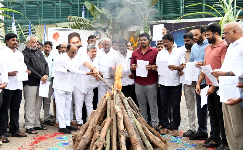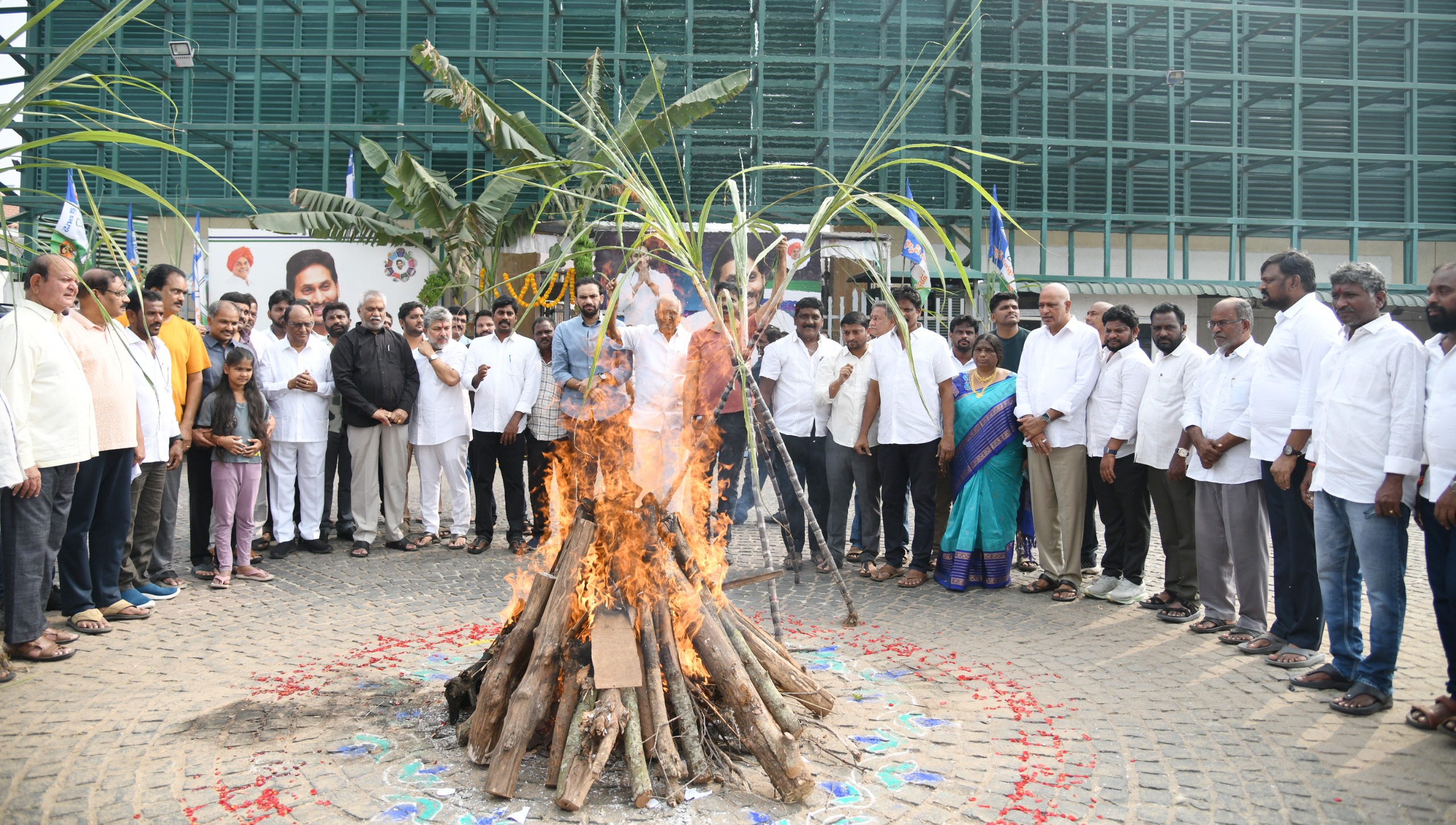 తాడేపల్లి : ప్రైవేట్ మెడికల్ కాలేజీలకు సంబంధించిన పీపీపీ జీఓలను రద్దు చేయాలని డిమాండ్ చేస్తూ వైయస్ఆర్ కాంగ్రెస్ పార్టీ ఆధ్వర్యంలో తాడేపల్లి కేంద్ర కార్యాలయం వద్ద భోగి సంబరాల సందర్భంగా నిరసన కార్యక్రమం నిర్వహించారు. ఈ కార్యక్రమంలో ప్రైవేట్ మెడికల్ కాలేజీల పీపీపీ జీఓ ప్రతులను భోగి మంటల్లో వేసి పార్టీ నాయకులు, కార్యకర్తలు తమ ఆగ్రహాన్ని వ్యక్తం చేశారు. ఈ సందర్భంగా వైయస్ఆర్సీపీ నాయకులు మాట్లాడుతూ, ప్రభుత్వ వైద్య విద్యా వ్యవస్థను ప్రైవేటీకరణ దిశగా తీసుకెళ్లే కుట్రలో భాగంగానే ఈ వైయస్ఆర్సీపీ పీపీపీ జీఓలను తీసుకువచ్చారని ఆరోపించారు. ఈ నిర్ణయంతో వైద్య విద్య సామాన్య ప్రజలకు అందని దూరంగా మారుతుందని, పేద విద్యార్థులకు తీవ్ర అన్యాయం జరుగుతుందని విమర్శించారు. ప్రభుత్వ వైద్య కళాశాలలు, ఆసుపత్రులను ప్రైవేట్ చేతుల్లోకి అప్పగించే ప్రయత్నాలను వైయస్ఆర్సీపీ తీవ్రంగా వ్యతిరేకిస్తుందని, ప్రజల ఆరోగ్యం, వైద్య విద్య పరిరక్షణ కోసం నిరంతరం పోరాటం చేస్తామని స్పష్టం చేశారు. ప్రజా వ్యతిరేక నిర్ణయాలను ప్రభుత్వం వెంటనే ఉపసంహరించుకోవాలని డిమాండ్ చేశారు. ఈ నిరసన కార్యక్రమంలో పార్టీ రాష్ట్ర, జిల్లా స్థాయి నాయకులు, కార్యకర్తలు పెద్ద సంఖ్యలో పాల్గొని ప్రభుత్వ విధానాలకు వ్యతిరేకంగా నినాదాలు చేశారు. ఈ కార్యక్రమాన్ని ప్రింట్, ఎలక్ట్రానిక్ మీడియా ప్రతినిధులు కవర్ చేశారు.