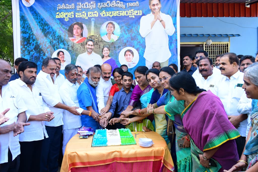 తాడేపల్లి: వైయస్ఆర్ కాంగ్రెస్ పార్టీ అధినేత, ఆంధ్రప్రదేశ్ మాజీ ముఖ్యమంత్రి వైయస్ జగన్ మోహన్ రెడ్డి గారి సతీమణి శ్రీమతి వై.యస్. భారతి రెడ్డి గారి పుట్టినరోజు వేడుకలు రాష్ట్రవ్యాప్తంగా వైయస్ఆర్ కాంగ్రెస్ పార్టీ నాయకులు, కార్యకర్తలు ఘనంగా నిర్వహించారు. పలు జిల్లాల్లో సేవా కార్యక్రమాలు, కేక్ కటింగ్ వేడుకలు నిర్వహించారు. విజయవాడ నిర్మల శిశుభవన్లో వేడుకలు తూర్పు నియోజకవర్గం కృష్ణలంకలోని నిర్మలా శిశుభవన్లో వైయస్ఆర్సీపీ ఎన్టీఆర్ జిల్లా అధ్యక్షుడు దేవినేని అవినాష్ , కార్పొరేటర్ అడపా శేషు, పలువురు పార్టీ నాయకులు చిన్నారులతో కేక్ కట్ చేసి భారతి రెడ్డి గారికి శుభాకాంక్షలు తెలిపారు. కార్యక్రమంలో రాష్ట్ర సోషల్ మీడియా ఆర్గనైజింగ్ ప్రెసిడెంట్ దొడ్డా అంజిరెడ్డి, ఎస్సీ సెల్ రాష్ట్ర వర్కింగ్ ప్రెసిడెంట్ యోనా రాజు, రైతు విభాగం జిల్లా అధ్యక్షుడు ఏలూరి శివాజీ, నాయకులు కిరణ్, అశోక్ యాదవ్, శివ, సురేష్, మనోజ్ తదితరులు పాల్గొన్నారు. ఎన్టీఆర్ జిల్లా వైయస్ఆర్సీపీ కార్యాలయంలో మహిళా విభాగం వేడుకలు జిల్లా వైయస్ఆర్సీపీ కార్యాలయంలో మహిళా విభాగం ఆధ్వర్యంలో వైయస్ భారతిరెడ్డి జన్మదిన వేడుకలు ఘనంగా నిర్వహించారు. ఈ వేడుకల్లో నగర మేయర్, మహిళా విభాగం జిల్లా అధ్యక్షురాలు రాయన భాగ్యలక్ష్మి, డిప్యూటీ మేయర్లు బెల్లం దుర్గ, అవుతూ శైలజా రెడ్డి, కార్పొరేటర్లు నిర్మలాకుమారి, రహేన నాహీద్, మహిళా నాయకులు స్వప్న, సుభాషిణి, సౌమ్య, ఇందిరా, లక్ష్మి, రమణ, శ్రావణి, సునీత, రుబిన్ తదితరులు పాల్గొన్నారు. భారతి అమ్మగారు కుటుంబ బాధ్యతలు, వ్యాపార బాధ్యతలు సమర్థవంతంగా నిర్వహిస్తూ జననేత వైయస్ జగన్ గారికి ప్రతి అడుగులోనూ తోడుగా నిలుస్తున్నారని మహిళా నాయకురాళ్లు అభినందించారు. నంద్యాల జిల్లాలో వైయస్ఆర్సీపీ నంద్యాల జిల్లా అధ్యక్షుడు, పాణ్యం మాజీ ఎమ్మెల్యే కాటసాని రాంభూపాల్ రెడ్డి ఆధ్వర్యంలో వైయస్ భారతిరెడ్డి గారి జన్మదిన వేడుకలు ఘనంగా నిర్వహించారు. ఈ సందర్భంగా పార్టీ నాయకులు వైయస్ భారతి రెడ్డి గారికి జన్మదిన శుభాకాంక్షలు తెలుపుతూ కేక్ కట్ చేశారు. కార్యక్రమంలో ర్నూలు జిల్లా అధ్యక్షులు ఎస్వీ మోహన్ రెడ్డి, శ్రీశైలం మాజీ ఎమ్మెల్యే శిల్పా చక్రపాణి రెడ్డి, పత్తికొండ మాజీ ఎమ్మెల్యే శ్రీదేవమ్మ, ఎస్వీ విజయ మనోహరి, కార్పొరేటర్లు , పార్టీ ముఖ్య నేతలు పాల్గొని శుభాకాంక్షలు తెలిపారు. కర్నూలు నగరంలో.. కర్నూలు నగరంలోని వైయస్ భారతిరెడ్డి జన్మదిన వేడుకలు ఘనంగా నిర్వహించారు. రాష్ట్ర మహిళా విభాగం వర్కింగ్ ప్రెసిడెంట్ ఎస్.వి. విజయ మనోహరి ఆధ్వర్యంలో కేక్ కట్ చేసి సంబరాలు చేసుకున్నారు. మహిళా నాయకురాళ్లు, కార్పొరేటర్లు పాల్గొని భారతమ్మ ఆరోగ్యం, ఆయురారోగ్యాలు, ప్రజ