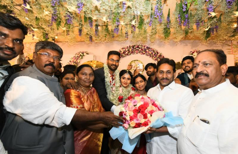 భీమవరం : శాసనమండలి ఛైర్మన్ కొయ్యే మోసేన్రాజు కుమారుడి వివాహ వేడుకకు మాజీ ముఖ్యమంత్రి, వైయస్ఆర్సీపీ అధినేత శ్రీ వైయస్ జగన్మోహన్రెడ్డి హాజరయ్యారు. భీమవరం సమీపంలోని పెదఅమిరం గ్రామంలో ఉన్న శ్రీ రాధాకృష్ణ కన్వెన్షన్ హాల్లో ఘనంగా నిర్వహించిన ఈ వివాహ వేడుకలో శ్రీ వైయస్ జగన్ పాల్గొని నూతన వధూవరులు తేజ రిషిత, చిట్టిరాజు (ఐపీఎస్)లకు వివాహ శుభాకాంక్షలు తెలిపారు. దంపతులు సుఖసంతోషాలతో, ఆయురారోగ్యాలతో జీవించాలని ఆకాంక్షిస్తూ ఆశీర్వదించారు. ఈ సందర్భంగా వివాహ వేడుకకు హాజరైన కుటుంబ సభ్యులు, బంధుమిత్రులు, ప్రజాప్రతినిధులు, పార్టీ నాయకులు శ్రీ వైయస్ జగన్కు ఘన స్వాగతం పలికారు. కార్యక్రమంలో పలువురు పార్టీ ప్రముఖులు పాల్గొని నూతన దంపతులను అభినందించారు.