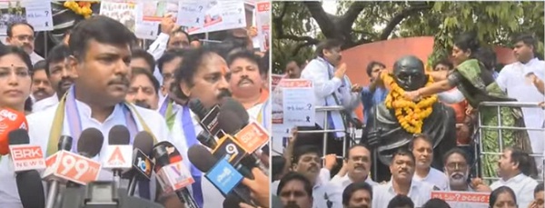 విశాఖ: వైయస్ఆర్సీపీ కార్పొరేటర్ పీవీ సురేష్పై పెట్టిన రౌడీషీట్ను తొలగించాలని డిమాండు చేస్తూ విశాఖ జీవీఎంసీ గాంధీ విగ్రహం వద్ద వైయస్ఆర్సీపీ నేతల నిరసన కార్యక్రమం చేపట్టారు. టీడీపీ నేతల ఒత్తిడితోనే రౌడీషీట్ తెరిచారని మాజీ మంత్రి గుడివాడ అమర్నాథ్ ఆగ్రహం వ్యక్తం చేశారు. కూటమి నేతలు వైయస్ఆర్సీపీ శ్రేణులపై కక్ష సాధింపు చర్యలకు దిగుతున్నారని మండిపడ్డారు. టీడీపీ నేతల సంపద సృష్టి కోసం కొత్త మద్యం పాలసీ తెచ్చారన్నారు. రాష్ట్ర ఖజానాకు గండి కొట్టి టీడీపీ నేతల ఆదాయం పంచుకున్నారని విమర్శించారు. మూడు నెలల్లో వీధికో బెల్ట్ షాపులు వస్తాయని ఆందోళన వ్యక్తం చేశారు.ప్రతి ఇంటికి మద్యం సరఫరా స్కీమ్ తీసుకొస్తారని ధ్వజమెత్తారు. రౌడీషీట్ ఎత్తేయకపోతే ఆందోళన తీవ్రతరం చేస్తామని గుడివాడ అమర్నాథ్ హెచ్చరించారు. టీడీపీ నేతల కేసులకు భయపడేది లేదని మాజీ ఎమ్మెల్యే వాసుపల్లి అన్నారు. టీడీపీ నేతల ఒత్తిడితోనే పీవీ సురేష్పై రౌడీషిట్ తెరిచారన్నారు. కార్యక్రమంలో వైయస్ఆర్సీపీ మహిళా విభాగం రాష్ట్ర అధ్యక్షురాలు వరుదు కళ్యాణి, తదితరులు పాల్గొన్నారు.